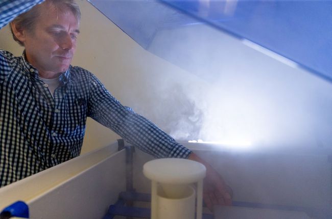 El ingeniero de pruebas Bob McPherson levanta un Surface Pro de la máquina de niebla salina.