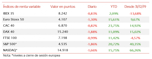 En una jornada de menos a más, las bolsas de Europa también han cerrado en rojo. Entre los principales índices bursátiles, el DAX 40 alemán ha perdido un 1,91%, el Footsie 100 inglés un 1,09%, el CAC 40 francés un 0,93% y el IBEX 35 español un 0,83%.
