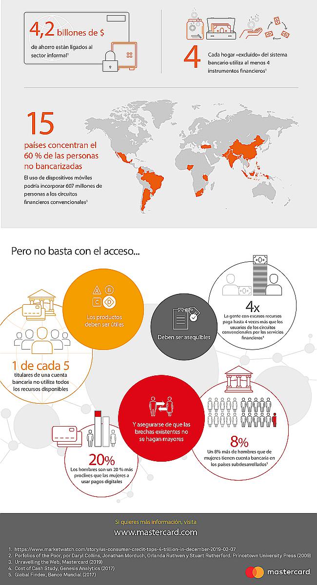 Mastercard confirma el poder de la tecnología móvil para impulsar la inclusión financiera. El estudio indica que en 15 países se concentra más de un 60% de la población mundial sin acceso a servicios bancarios. En ellos, hay 607 millones de personas con un teléfono móvil y sin cuenta bancaria, a quienes la tecnología móvil podría brindar acceso inmediato a los beneficios de la inclusión financiera.
