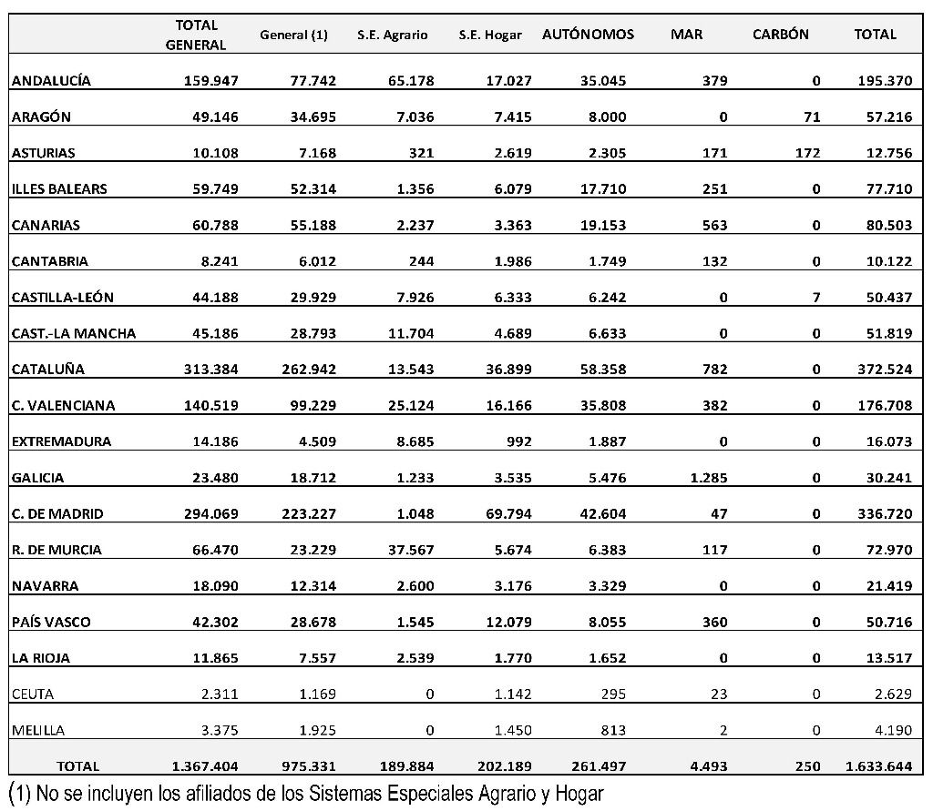 De la cifra total de ocupados en octubre 890.199 son hombres y 743.445 mujeres. Los datos de afiliados por comunidades autónomas se distribuyen así: