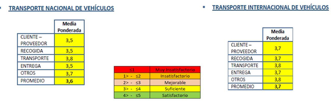 La valoración para el transporte de vehículos por carretera muestra un ligero descenso con respecto al ejercicio anterior, tanto para transporte nacional como internacional. El resultado del indicador, por debajo de 4, pone de manifiesto que hay margen de mejora en algunos aspectos de este modo de transporte.