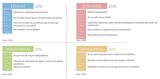 Los compradores Entendidos se decantan por berlinas y SUV. Los Optimizadores, por monovolumen y SUV. Los Independientes prefieren utilitarios y compacto. Los Eficientes se deciden por utilitarios de segunda mano.