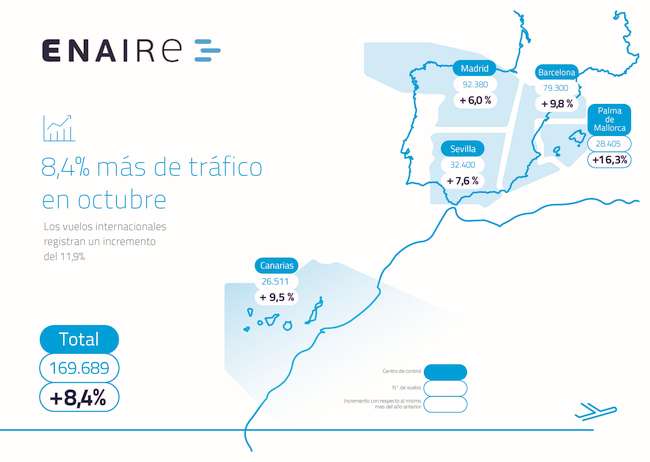 Ha sido el mes de octubre con más tráfico aéreo total en la historia de ENAIRE y con mayor tráfico internacional y sobrevuelos (vuelos que no tienen como origen ni destino un aeropuerto español).