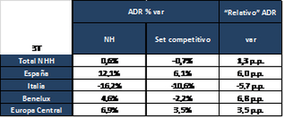 La estrategia de gestión de precios implementada en los nueve primeros meses del año ha permitido alcanzar un aumento del ingreso medio por habitación disponible (RevPAR) del 6,3%, fundamentalmente por un crecimiento de los precios del 5,2% y de la ocupación del 1,0%. Cabe señalar que en el tercer trimestre estanco aumenta el RevPAR un 6,1%, en un 95% vía incremento de precio medio (+5,8%), con un aumento plano de la ocupación del 0,3%. Nuevamente, la estrategia llevada a cabo ha permitido a NH Hotel Group superar un trimestre más a sus competidores directos en los principales destinos donde opera.