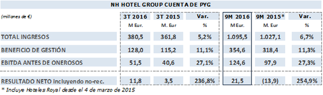 NH Hotel Group ha presentado sus resultados correspondientes al tercer trimestre de 2016, que confirman la continuidad de la positiva evolución experimentada durante la primera parte del año.