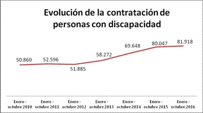 Como podemos observar, en 2016 se registran 4 ejercicios seguidos de incremento en la contratación de personas con discapacidad: durante este año, en el periodo comprendido entre enero y octubre, se han firmado 81.918 contratos, un 2,3% más que el mismo periodo de 2015 y un 57,8% más que en 2012.