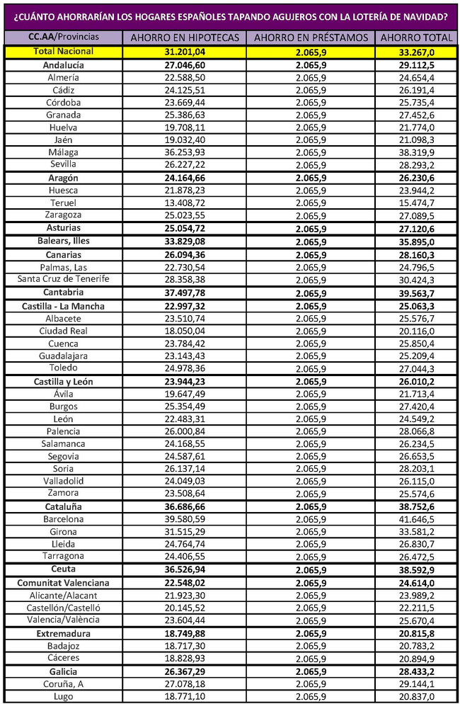 Si los agraciados decidieran, además, poner fin a la deuda que mantienen en préstamos al consumo (9.032,61 euros de media por hogar), podrían ahorrar una cantidad mayor: otros 2.065,9 euros. Sumando esta cantidad a los 31.201,04 euros que se ahorrarían al finiquitar la deuda hipotecaria, el ahorro total por familia alcanzaría los 33.267 euros.