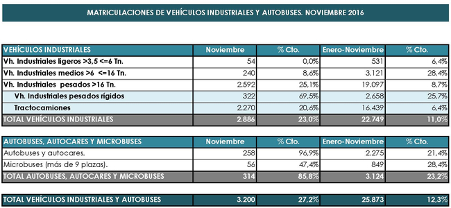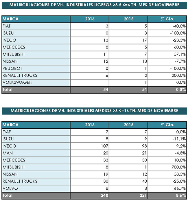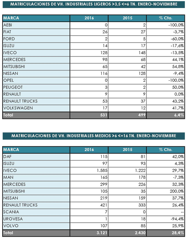 En Noviembre, los vehículos industriales ligeros, que tienen poco peso sobre este tipo de vehículos, se mantienen con un volumen de 54 unidades. En la suma de los once primeros meses crecen un 6,4% con un total de 531 unidades. En el caso de los industriales medios, en Noviembre registran un ascenso del 8,6% con 240 unidades matriculadas. En el periodo Enero-Noviembre alcanzan un volumen de 3.121 unidades y un crecimiento del 28,4%. Los industriales pesados, reflejan un alza del 25,1%, habiéndose matriculado un total de 2.592 unidades. En el cómputo de los once primeros meses del año, este segmento refleja un crecimiento del 8,7% y 19.097 unidades.