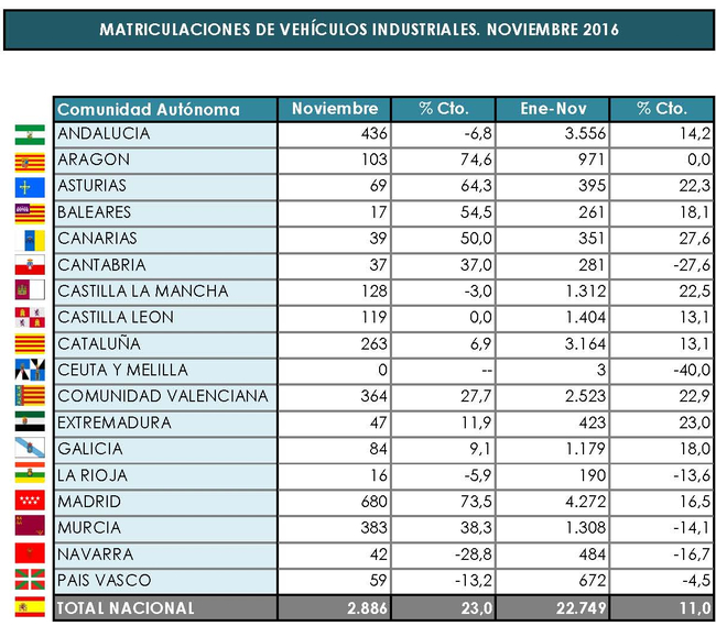 El mercado de vehículos industriales crece un 23% en Noviembre, con un volumen de 2.886 unidades, siendo el mayor volumen para un mes de Noviembre desde el año 2007. En el periodo Enero-Noviembre acumula un volumen de 22.749 matriculaciones, lo que representa un incremento del 11% con respecto al mismo periodo del año anterior. Este resultado nos permitirá superar las 24.000 unidades este año, circunstancia que no ocurría desde el año 2008.
