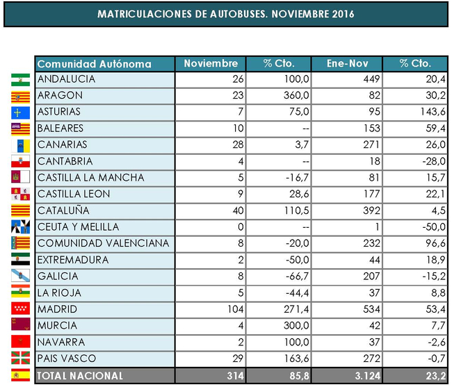 Los autobuses, autocares y microbuses acumulan un alza del 23,2% hasta Noviembre.