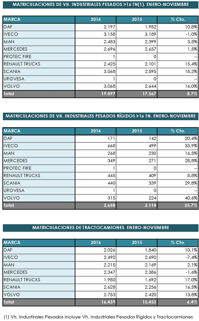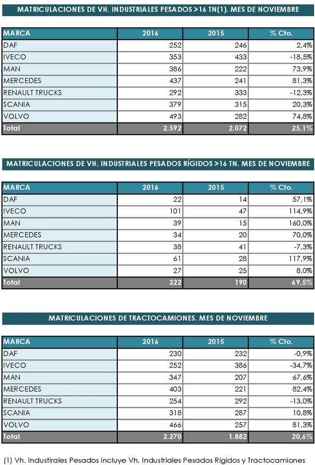 Dentro de esta categoría, los industriales pesados rígidos también muestran tasas positivas en el mes de Noviembre con un 69,5% de crecimiento y un volumen de 322 unidades, totalizando un volumen de 2.658 unidades hasta Noviembre y un alza del 25,7%. Por último, el segmento de los tractocamiones experimenta un crecimiento del 20,6% en Noviembre con un total de 2.270 unidades. En el acumulado de Enero-Noviembre registra un crecimiento del 6,4% y un volumen total de 16.439 unidades matriculadas