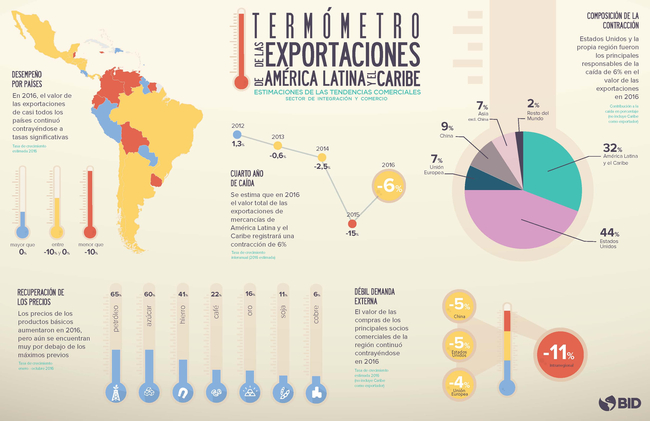 Las exportaciones de América Latina y el Caribe caerán alrededor de US$50 mil millones en 2016, es decir un 6 por ciento, lo que muestra una desaceleración en comparación con la fuerte contracción de 15 por ciento sufrida el año previo. La mejora relativa de la estimación se debe principalmente al repunte de los precios de los productos básicos, según un estudio del Banco Interamericano de Desarrollo (BID) que incluye datos detallados para 24 países de la región. El monto total exportado en 2016 se aproximaría a los US$850 mil millones.