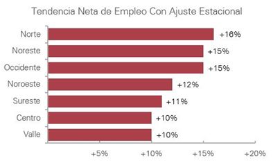 Empleadores en el Norte, Occidente y Noreste reportan las expectativas con ajuste estacional más optimistas de +16%, +15% y +15%, respectivamente.