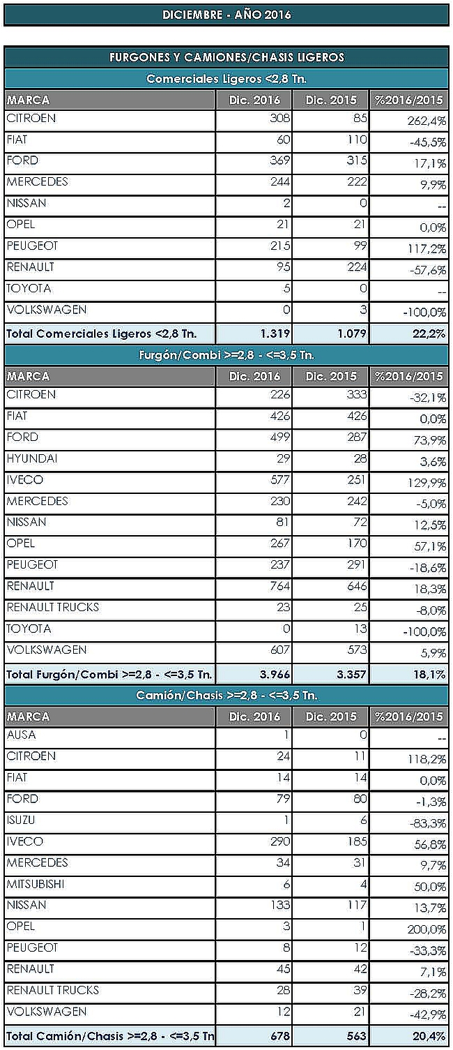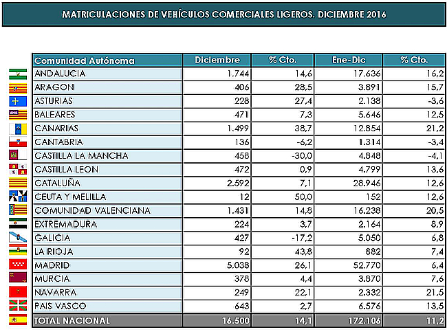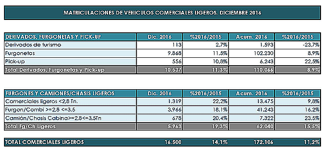 El mercado de vehículos comerciales ligeros en España ha registrado un alza del 14,1% de las matriculaciones en diciembre, con un volumen total de 16.500 unidades. En el conjunto del año 2016, la venta de este tipo de vehículos ha alcanzado un crecimiento del 11,2%, totalizando 172.106 unidades. A pesar del incremento registrado no hay que perder de vista que en 2016 se han matriculado casi un 38% menos vehículos comerciales ligeros que en el año 2007, último ejercicio antes del inicio de la crisis; estaríamos a 103.000 unidades de las vendidas entonces.