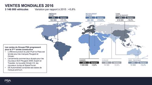 En 2016, aumento de ventas del 5,8%, hasta 3.146.000 unidades. La ofensiva de producto del plan Push to Pass para las marcas PEUGEOT y CITROËN ya está en marcha. Exitosos lanzamientos comerciales del SUV PEUGEOT 3008, los modelos Expert y Traveller, el nuevo CITROËN C3 y los nuevos Jumpy y SpaceTourer. DS Automobiles consolida su base de marca premium.