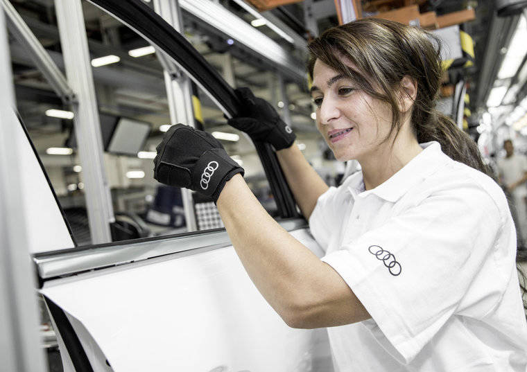 Los empleados de montaje de puertas en los automóviles Audi instalan aproximadamente 300 paneles por turno. Un trabajo que somete a gran estrés a la muñeca y a la palma de la mano. Para reducir este estrés, Audi ha desarrollado una órtesis especial en colaboración con Spörer AG, una compañía de Ingolstadt especializada en tecnología ortopédica. Cuando se utiliza este guante especial, la mano se somete a menos tensión, pero conservando su sentido del tacto y la máxima movilidad. “Con las órtesis de producción, estamos demostrando una vez más que la ergonomía en las líneas de montaje tiene la máxima prioridad en Audi. Esto nos ayuda a mantener el buen estado de salud de nuestros empleados, y también mejora la eficacia y la sensación de bienestar en nuestras áreas de producción”, explica Hubert Waltl, responsable de Producción de Audi.