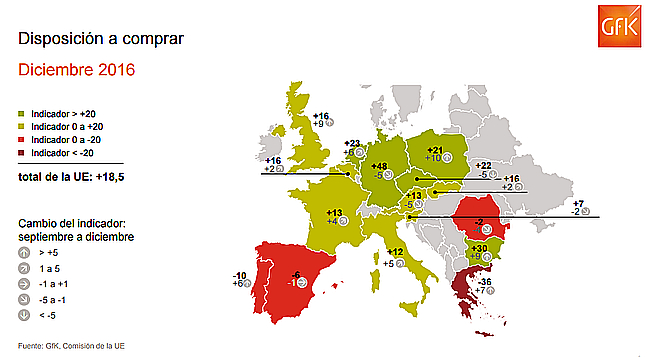 Finalmente, los consumidores que plantean una mayor disposición a comprar son los alemanes, a pesar de registrar la cifra más baja de todos los trimestres en este indicador en 2016, con 48 puntos. Bulgaria es el siguiente en este ranking con 30 puntos y un incremento de 24 frente a diciembre de 2015. De nuevo es Grecia quien ocupa el último lugar con -36 puntos, aunque tras mejorar 7 en relación al trimestre anterior.