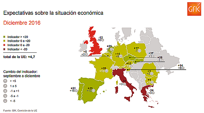 Los principales temas que han llenado de titulares de Europa a finales de año (guerra en Siria, terrorismo, elecciones presidenciales en EEUU y alza de partidos nacionalistas, entre otros) parece que no han afectado en demasía a los consumidores. Quizá lo que ha jugado un papel más relevante en sus percepciones han sido las cifras de crecimiento de cada país.