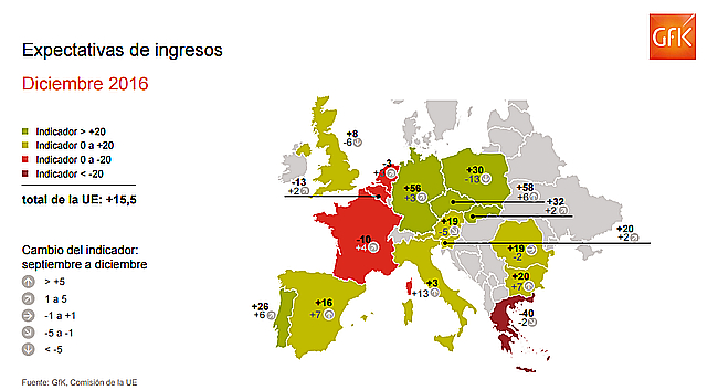 Si analizamos la confianza de los consumidores europeos se puede afirmar que durante el último trimestre de 2016 ha experimentado un crecimiento muy positivo. Aunque durante el año, los indicadores de expectativas económicas, ingresos y gasto no se comportaron de manera uniforme.