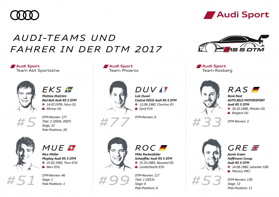 Por primera vez, el suizo Nico Müller, que celebró su primera victoria en el DTM la pasada temporada, formará parte del Audi Sport Team Abt Sportsline junto a Mattias Ekström. El francés Loïc Duval será el nuevo compañero de Mike Rockenfeller en el Audi Sport Team Phoenix. Ambos se conocen muy bien del programa de Audi en LMP. René Rast competirá junto a Jamie Green en el Audi Sport Team Rosberg, la escuadra con la que consiguió su primer triunfo en el DTM el año pasado. “Mattias (Ekström) se ha convertido en parte de la familia en el equipo Abt Sportsline y Nico (Müller) se ha adaptado perfectamente con nosotros en su primera temporada”, comenta Hans-Jürgen Abt, Director de Equipo de Audi Sport Team Abt Sportsline. “Estoy convencido de que con la veteranía del piloto sueco y la juventud del suizo tenemos uno de los mejores equipos”.