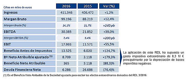 El beneficio neto atribuible ajustado este año ha supuesto un crecimiento superior al 179% respecto al obtenido en el año anterior y se ha alcanzado una cifra por encima de los 8,7 millones de Euros, excluyendo la aplicación del RDL 3/2016 aprobado en el mes de diciembre de 2016, que ha supuesto un impacto negativo extraordinario contable de 8,3 Millones de Euros por depreciación de bases imponibles negativas, que no generan salida de caja.