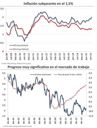 - El nivel reducido de capacidad ociosa en EEUU debería promover un progresivo incremento de la inflación subyacente a lo largo de 2016: tanto la inflación general como la subyacente podrían terminar el año en tasas en el entorno del 2% (siempre que el dólar no se aprecie en exceso).