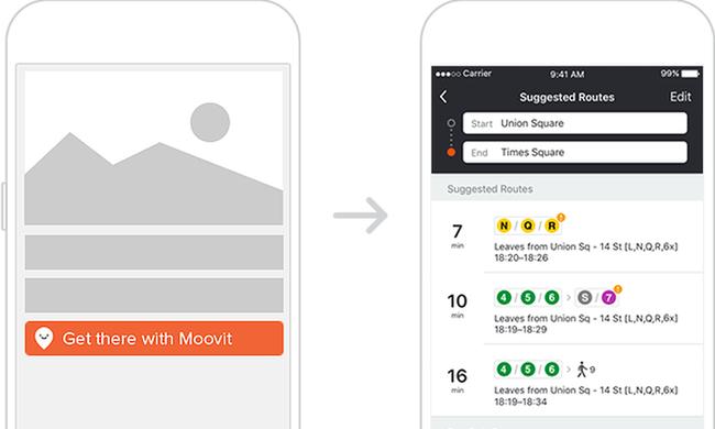 - Deeplinking: Experiencia desde las aplicaciones nativas de la empresa directamente al planificador de viajes de móvil Moovit en Android o iOS.