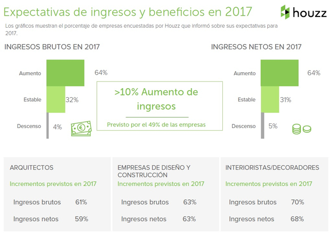 Houzz, la plataforma online líder a nivel mundial en el diseño y la renovación del hogar, presenta hoy el estudio de mercado Houzz2017 en España. El informe ofrece una visión general del rendimiento durante 2016 y una perspectiva de 2017 para los negocios de renovación y diseño residencial, basado en los datos facilitados por profesionales de la comunidad de Houzz en España. El estudio reveló que la mayoría de las empresas anticipan un crecimiento generalizado de ingresos y ganancias en 2017 – lo afirma un 64%, en ambos casos.