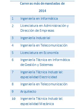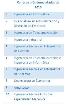 Y también por tercer año consecutivo, la carrera de Informática no sólo lidera el ranking, sino que sus ramas están presentes en cinco de los puestos más ofertados. No sorprende que la tendencia continúe en plena Era Digital. Las empresas requieren cada vez más perfiles técnicos e ingenieros especializados en informática dado que sus competencias se presentan como necesarias en casi cualquier tipo de compañía.Es más, podemos afirmar que este puesto es actualmente uno de los pocos que puede presumir de tener pleno empleo y un futuro más esperanzador.