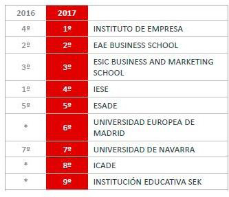 segunda mejor escuela de negocios de España en el Ranking Merco 2017. La clasificación sectorial ha sido liderada por el Instituto de Empresa, y EAE mantiene la misma posición que ocupó en el ranking de los años 2014, 2015 y 2016. Además, EAE