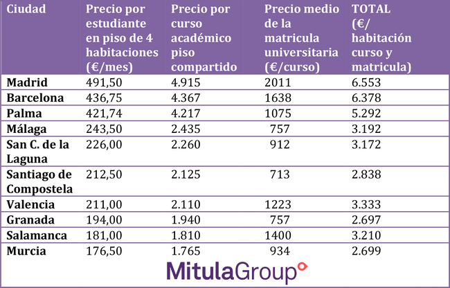Mitula Group determina que Barcelona, Madrid y Palma son las tres ciudades españolas[1] donde resulta más caro vivir y estudiar, con un gasto total alrededor de los 6.000 euros anuales en los tres casos. Cifras, sin duda, no aptas para todas las economías familiares.