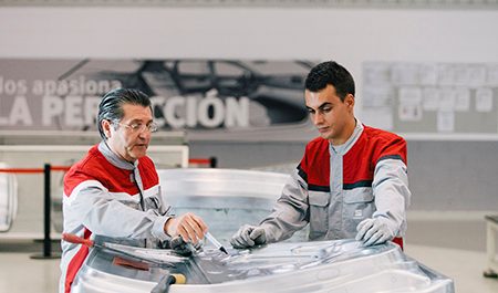 Una puerta al mundo laboral: Para Antonio, que ha visto pasar a muchos jóvenes de la Escuela, el resultado de las 1.700 horas de prácticas es que “cuando terminan los estudios y entran a trabajar, se adaptan mucho más rápido y conocen mejor la empresa porque ya se han formado aquí”. De estudiar sin coches a practicar con robots: “Aunque parezca una contradicción, a mediados de los años 70, no había ni un solo coche en el taller porque nos formaban para mantenimiento de instalaciones. Estaba todo lleno de cables de cobre, reglas y cartabones”, recuerda Molina mientras pasea por el centro con Alberto. Hoy, las nuevas tecnologías están al alcance de los alumnos, como una herramienta más de formación. “La Escuela ha ido evolucionando con las necesidades de la industria del automóvil y ha sabido adaptarse”, concluye Molina desde su veteranía.