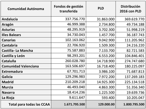 Distribución territorial de fondos para el año 2016 para su gestión por las CCAA