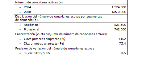 Los clientes residenciales concentraron en 2015 el 53% del número total de conexiones, correspondiendo el 47% restante a clientes profesionales. Por zonas geográficas, Madrid y Cataluña agrupan conjuntamente alrededor del 40% del parque total.