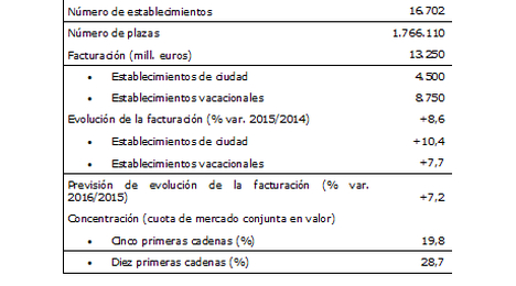 Tras un inicio de 2016 marcado por el notable crecimiento de la demanda de alojamiento en establecimientos hoteleros y del ingreso medio por habitación, se prevé que en el conjunto del año se mantendrá el dinamismo del sector, estimándose un crecimiento de alrededor del 7%, lo que permitiría alcanzar los 14.200 millones de euros.