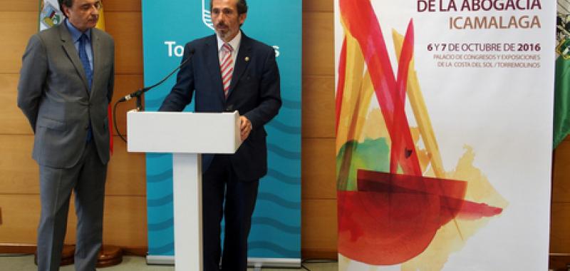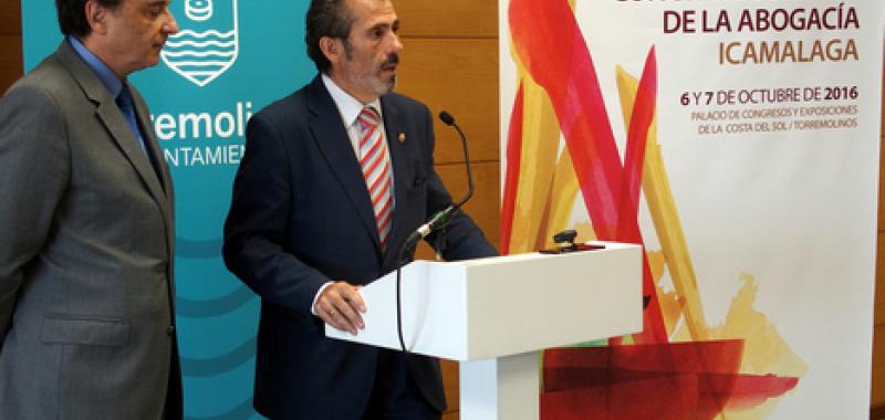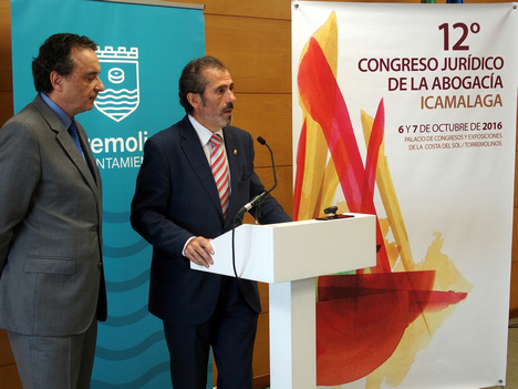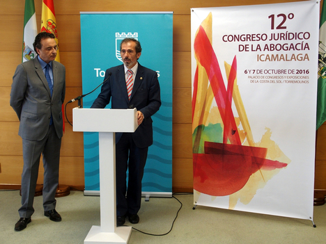 El decano del Colegio de Abogados, Francisco Javier Lara, y el alcalde de Torremolinos, José Ortiz, presentan el encuentro y dan a conocer el avance del programa. Las novedades referentes a las cláusulas bancarias abusivas, la crisis de los refugiados, el ‘fair play’ financiero de la UEFA o el ‘derecho al olvido’ en internet son algunos de los asuntos que se tratarán en las 70 ponencias previstas.