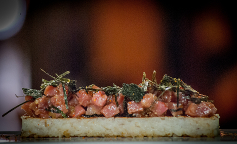 - Tartar de atún rojo con wasabi fresco sobre arroz de sushi a la plancha (Plato fuera de carta, según mercado si hay atún rojo)