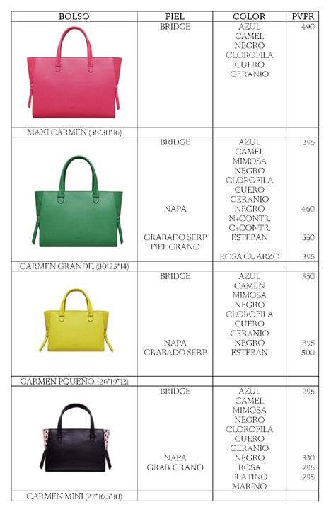 Se trata de un bolso versátil, cómodo, ligero, que se puede llevar de la mano o colgado del hombro, con muchos detalles que desde cualquier perspectiva le confieren un carácter propio. En diferentes pieles (napa, grabado, exótica), tamaños (Maxi, Grande, Pequeño y Mini) y colores atractivos, con líneas puras, minimalista y atemporal, este accesorio tiene vocación para ser eterno, transmitirse de madres a hijas y convertirse en un clásico, algo que solo los grandes consiguen. Como los buenos actores, CARMEN puede jugar a ser algo distinto, disfrazarse, ponerse un lazo, un volante o dejar que diseñadores de la talla de Ana Locking lo versionen porque su espíritu siempre está a salvo.