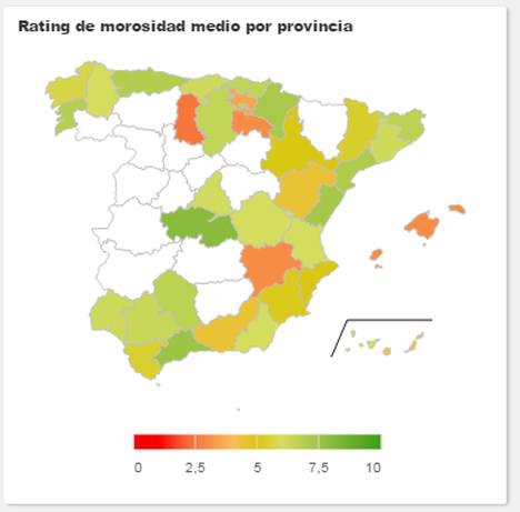 Las provincias con peor rating de morosidad son Palencia (2,5) Baleares (3,0), Albacete (3,0), La Rioja (3,0) y Álava (3,5).