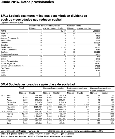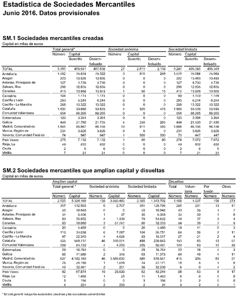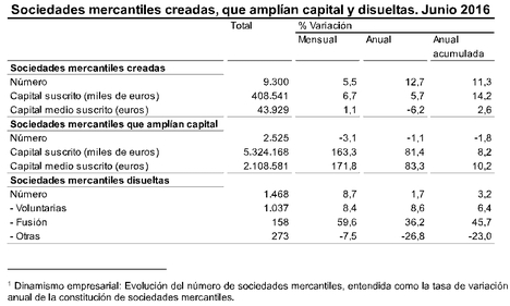 En junio se crean 9.300 sociedades mercantiles, un 12,7% más que en el mismo mes de 2015. El capital suscrito para su constitución supera los 408 millones de euros, con un aumento del 5,7%. El capital medio suscrito (43.929 euros) disminuye un 6,2% en tasa anual.