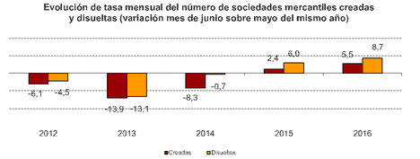 Para contribuir al análisis e interpretación de los datos, el gráfico siguiente muestra la variación del número de sociedades mercantiles creadas y disueltas entre los meses de mayo y junio en los cinco últimos años. En 2016 la variación mensual del número de sociedades creadas es del 5,5% y el de las disueltas del 8,7%.