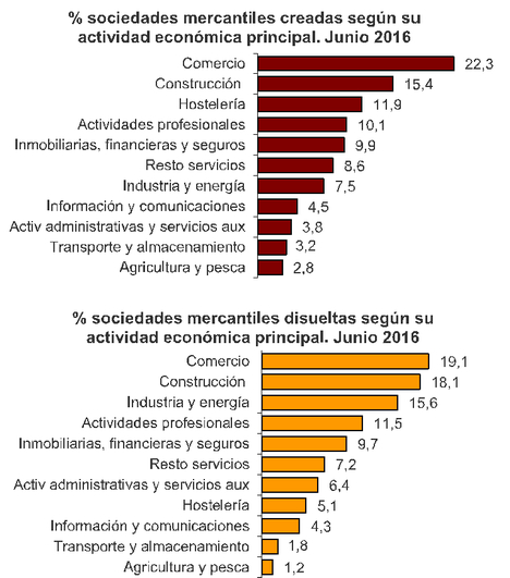 El 22,3% de las sociedades mercantiles creadas en junio corresponde al Comercio y el 15,4% a la Construcción. En cuanto a las sociedades disueltas, el 19,1% pertenece al Comercio y el 18,1% a la Construcción.