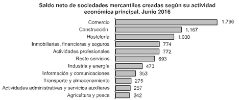 La actividad con mayor saldo neto de sociedades mercantiles creadas en el mes de junio de 2016 es Comercio, con 1.796.
