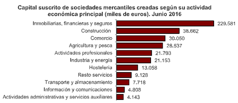 La actividad con mayor capital suscrito de sociedades mercantiles creadas es Inmobiliarias, financieras y seguros, con 229,58 millones de euros.