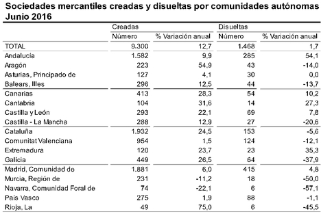 El número de sociedades mercantiles disueltas en junio es de 1.468, un 1,7% más que en el mismo mes de 2015. De éstas, el 70,6% lo hicieron voluntariamente, el 10,8% por fusión y el 18,6% restante por otras causas.