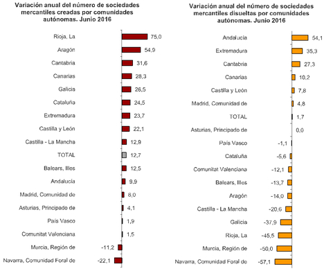 En términos de variación anual del número de sociedades mercantiles creadas, La Rioja (75,0%), Aragón (54,9%) y Cantabria (31,6%) registran las mayores tasas.