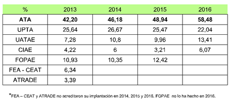 Tras ATA y UPTA, les siguen UATAE (13,41%) y CIAE (6,07%). ATA consolida su línea ascendente en implantación según el siguiente esquema:
