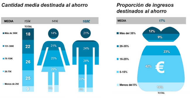 Ahorran de media 155€ al mes. Esta cantidad representa un 17% de sus ingresos. Los hombres ahorran un 19% más que las mujeres.