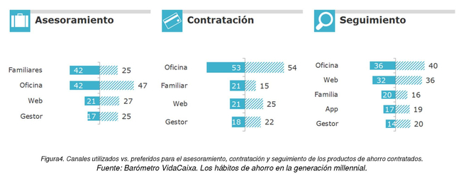 A pesar de ser la generación de las nuevas tecnologías (tienen de media tres dispositivos electrónicos), los canales que más utilizan los millennials para asesorarse sobre productos de ahorro son familiares y oficinas, en ambos casos en un 42%. Aun así, afirman que preferirían utilizar más de lo que lo hacen la web (25%) y un gestor (25%).