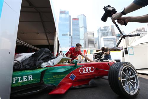 A mediados de septiembre la organización de la Fórmula E embarcó los cuatro coches de carreras del equipo en un avión y los enviaron a Hong Kong. En total, el equipo ha enviado cerca de ocho toneladas de material para la gira mundial de la Fórmula E. El primer paso fue la creación del pit lane temporal en el paddock del circuito de carreras, que se encuentra cerca de la famosa terminal del Star Ferry en el puerto de Hong Kong. Posteriormente, el equipo comenzó a trabajar en los coches de carreras y los presentó a la FIA para las verificaciones técnicas, incluyendo el marcaje de los motores, transmisiones y otros componentes.